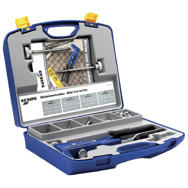 Ausführung: - GBM 10 mit Gewindedorn und Mundstück M5 - inklusive Gewindedorne und Mundstücke M4 und M6 - verschiedene Blindnietmuttern-Abmessungen M4 bis M 6 aus Alu für Fügegutstärken von 0,25 bis 3 mm - Blindnietmuttern-Box, inklusive 4 Blindnietmuttern-Abmessungen - stabile Kunststoffbox